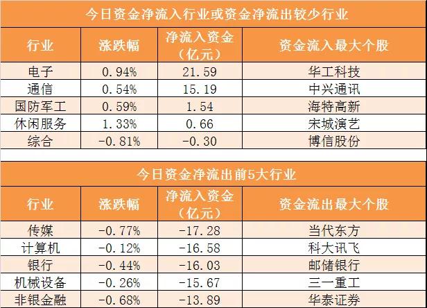 28个申万一级行业中,4个行业实现资金净流入,其中电子行业净流入21.59亿元居首。