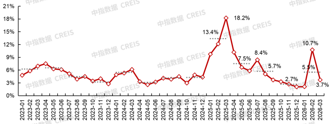 溢价率方面,开年以来,在优质地块供应力度放缓下,300城溢价率整体仍处于低位。根据中指数据,2026年一季度(截至3月22日),300城住宅用地平均溢价率为5.2%,处于历史同期较低水平。其中,1月土地市场相对平淡,300城住宅用地平均溢价率维持低位;2月在广州马场地块等高溢价地块带动下,溢价率升至10.7%;3月截至22日,平均溢价率降至3.7%,土拍市场整体保持平淡。