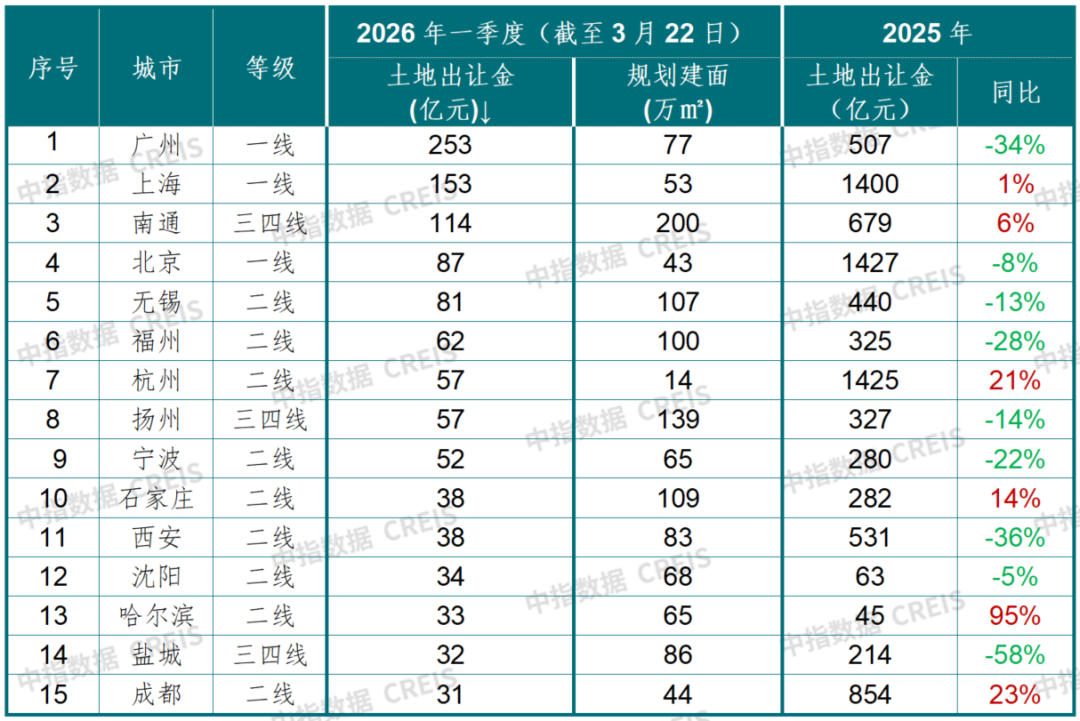 今年以来,多地供地节奏仍趋缓,300城土地市场延续缩量态势。根据中指数据,单月来看,3月截至22日,300城住宅用地推出规划建面1501万平方米,同比下降38.2%;成交1541万平方米,同比增长22.8%;土地出让金为634亿元,同比增长10.1%。累计来看,2026年一季度(截至3月22日),300城住宅用地推出规划建面6067万平方米,同比下降19.7%;成交5521万平方米,同比下降19.2%;300城住宅用地出让金同比下降36.5%。