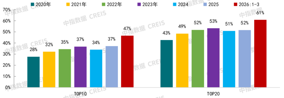 从城市集中度来看,根据中指数据,2026年一季度(截至3月22日),全国TOP20城市宅地出让金占全国比重为61%,较2025年全年提升9个百分点。全国住宅用地出让金排名靠前的城市中,多核心一二线城市。年初以来,重点城市土拍活动较少,其中广州在天河区马场地块(总价249.7亿元,由越秀获取)带动下,跃升一季度土地出让金首位;上海、北京土地市场相对平稳,出让金在百亿元左右,南通宅地出让金达114亿元,更多为地方国资获取。