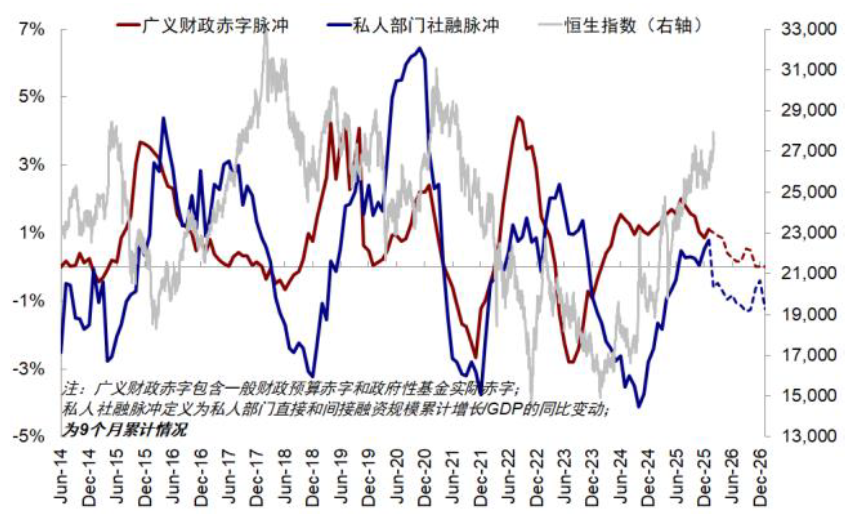 1) 基本面A股强于港股。基准情形下中国信用周期震荡走弱,A股受益于更多科技硬件、制造外需、PPI走高和反内卷受益的周期板块,今年盈利预计增速略高于港股,我们自上而下测算2026年港股盈利增速预计为3-4%(非金融增长6-7%,金融预计零增长),可能略低于A股的4-5%(非金融增长8%,金融增长1.6%)。