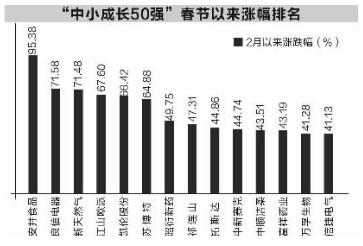 春节以来受疫情冲击,A股出现大幅震荡,上证指数春节后至今累计下跌2.73%,逾六成上市公司股价下跌。相比之下,“中小成长50强”市场表现韧性十足,平均涨幅26.5%,跑赢大盘超29个百分点;46家公司股价上涨,占比92%。