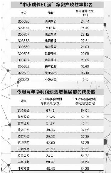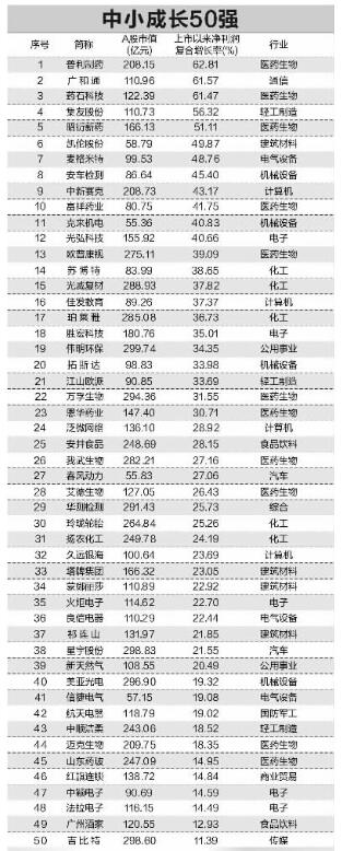不少中小市值公司正快速崛起,业绩和股价同步上扬。证券时报·数据宝根据上市公司的市值规模、业绩、盈利能力、成长能力、商誉等情况,评选出A股“中小成长50强”。