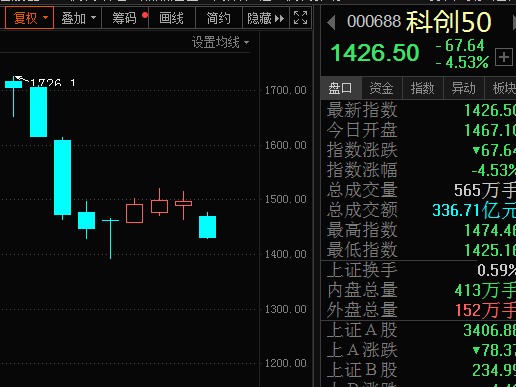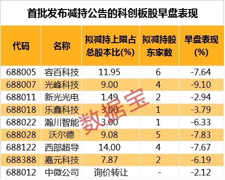 在科创板公司上市一周年之际,相关公司迎来了减持潮,其中解禁最大的中微公司将尝试询价转让的方式进行减持,9名股东拟通过询价方式转让公司2.66%股份。另有8家科创板公司股东选择常规减持路径,分别是西部超导、嘉元科技、沃尔德等。受集中减持影响,早盘科创50指数大跌4.53%,最新指数收报1426.5点。