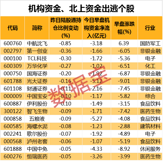 机构资金整体净流出近百亿,券商、白酒板块净流出额居前,东方财富、光大证券、中信证券、五粮液等净流出额几乎均超过5亿。早盘机构资金净流出1亿元的个股共有17只,除军工股中航沈飞逆势大涨外,其余16股均下跌。