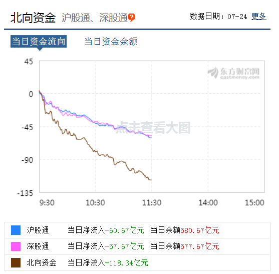 北上资金继昨日净流出36.54亿之后,今日早盘继续大幅流出。根据额度计算,北上资金早盘净流出额118.34亿,其中沪股通净流出60.67亿,深股通净流出57.67亿。
