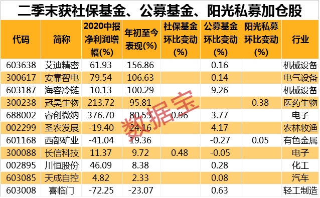 数据宝统计显示,已发布中报股中,获社保基、公募基金或阳光私募加仓的仅有11只。其中获社保基金环比加仓的仅有睿创微纳及长信科技;获公募基金加仓的有海容冷链、圣农发展、睿创微纳等,其中海容冷链加仓比例高达9.26%;阳光私募加仓股仅有冠昊生物及西部矿业。这11股上半年均实现盈利,但西部矿业、喜临门及圣农发展业绩有所下滑。