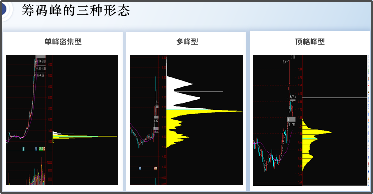 筹码峰分类:单峰密集(重点)、多峰分布、顶格峰。
