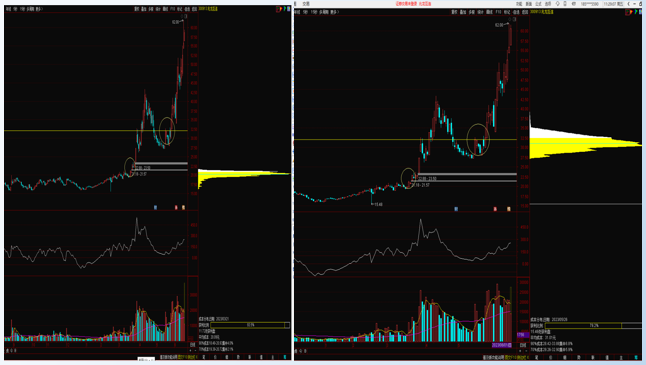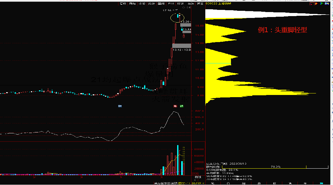 股价走主升后的筹码峰的变化很多,筹码会往上移动,这时的主升操作大部分以K线盘口语言为主,比如大阴线,反胜阴阳顶等。