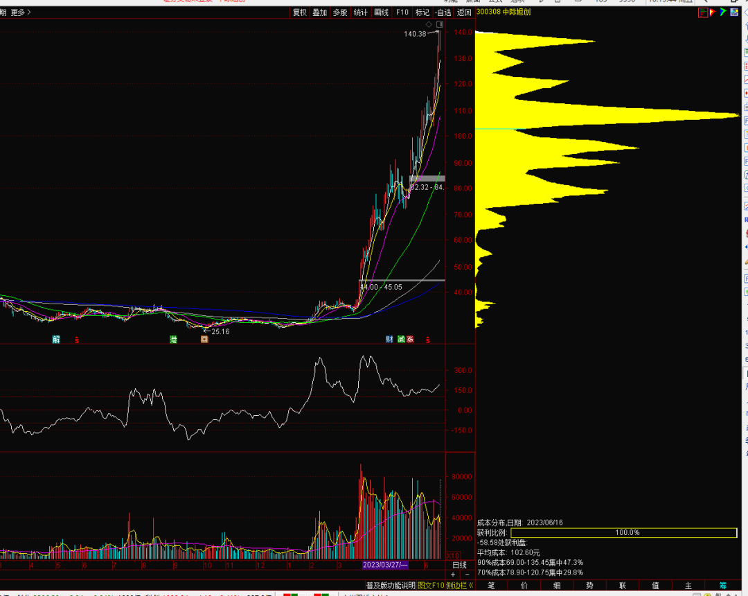 筹码峰又称股票移动成本分布,表示股票在不同价格的买入数量有多少,在该价位上是盈利还是亏损。