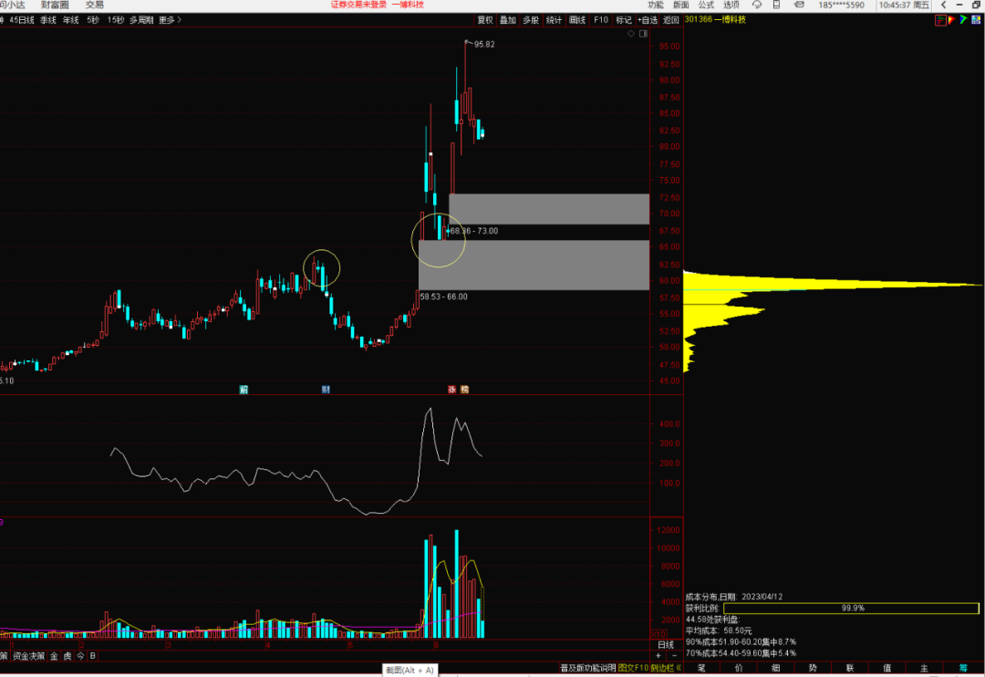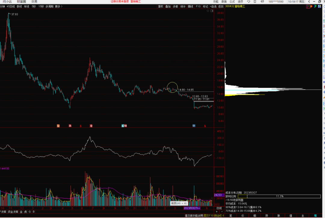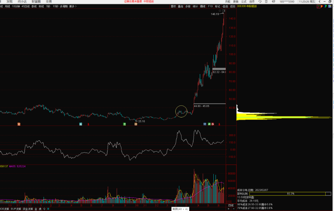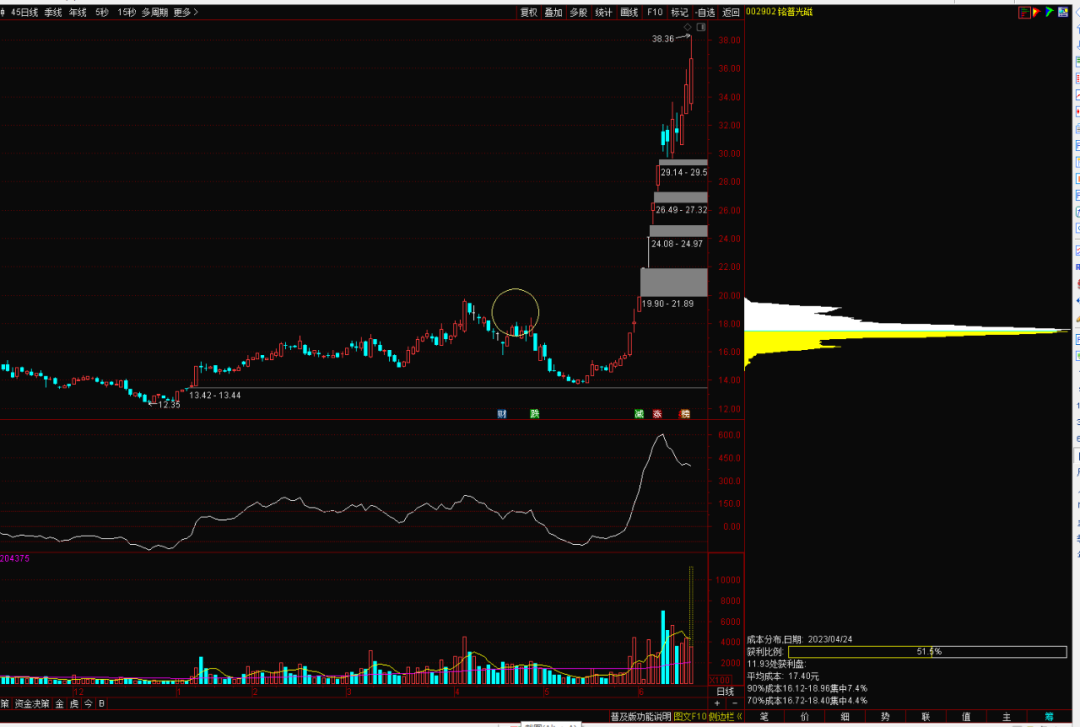 这里要注意的是,筹码峰值下方的方框里的获利比例和筹码集中度,获利比例越大越好,筹码集中度则越小越好。