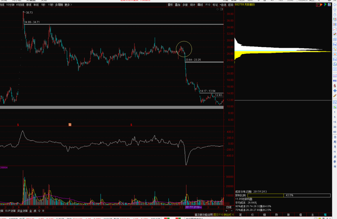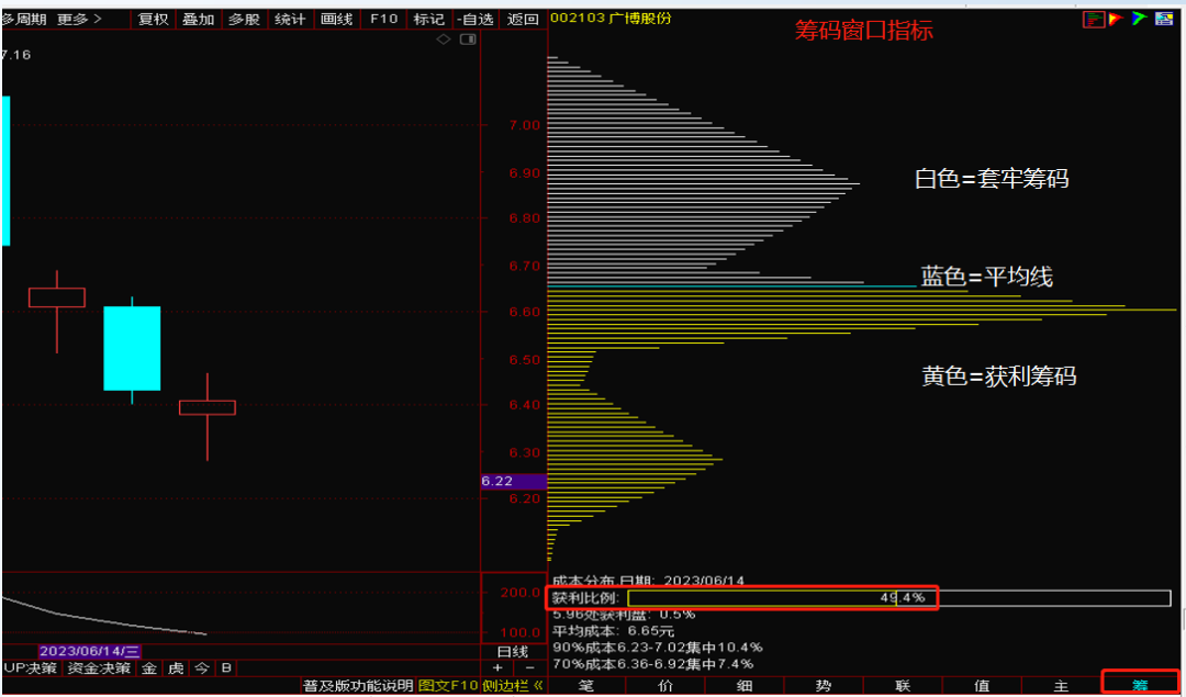 接下来我们通过解密筹码窗口的细分指标,来搞懂筹码峰分别代表着什么秘密。从该行情软件细分指标来看:
