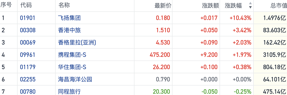 截至周一发稿时,多只酒旅概念个股涨势活跃。其中,香港中旅(00308.HK)涨超3%,携程集团-S(09961.HK)涨近2%,华住集团-S(01179.HK)等个股跟涨。