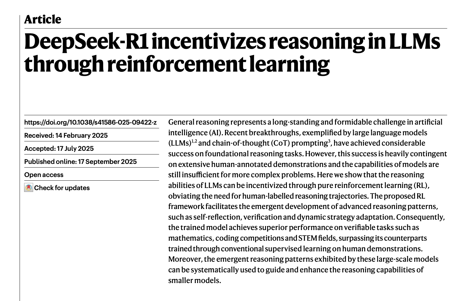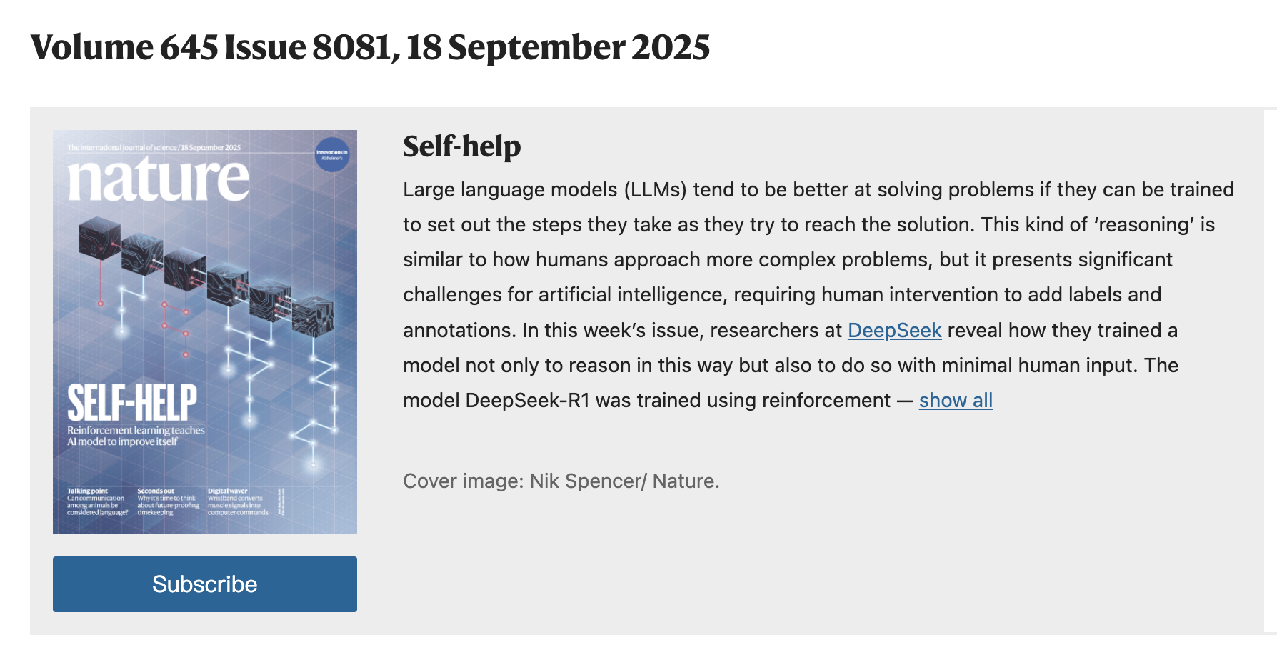 9月18日,DeepSeek再次引发轰动。由DeepSeek团队共同完成、梁文锋担任通讯作者的DeepSeek-R1研究论文,登上了国际权威期刊《Nature》的封面。