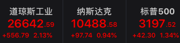 周二美股尾盘走强,三大股指集体收高。截至收盘,道指涨2.13%报26642.59点,标普500涨1.34%报3197.52点,纳指涨0.94%报10488.58点。卡特彼勒涨近5%,领涨道指。石油股普涨,埃克森美孚 、雪佛龙均涨超3%。波音涨2.48%,公司获得美国空军超200亿元订单。富国银行跌4.57%,该行自2008年以来首次录得亏损。