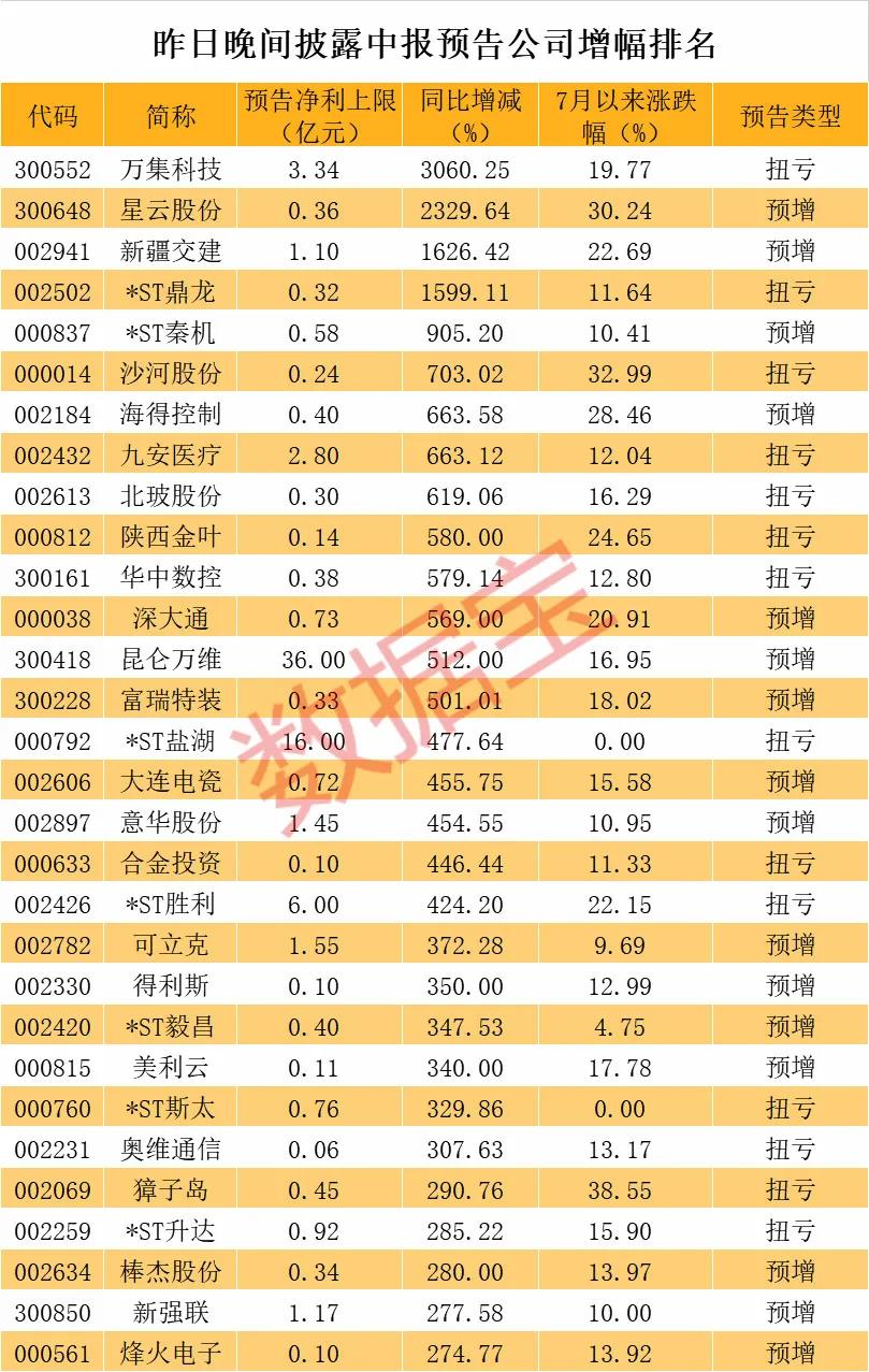 昨日晚间,又有一批业绩暴增股披露中报业绩预告。数据显示,万集科技、星云股份、新疆交建等个股中报净利增速有望超过10倍。昨日晚间预告净利增速较高的个股详细名单如下表。(数据宝 陈见南)