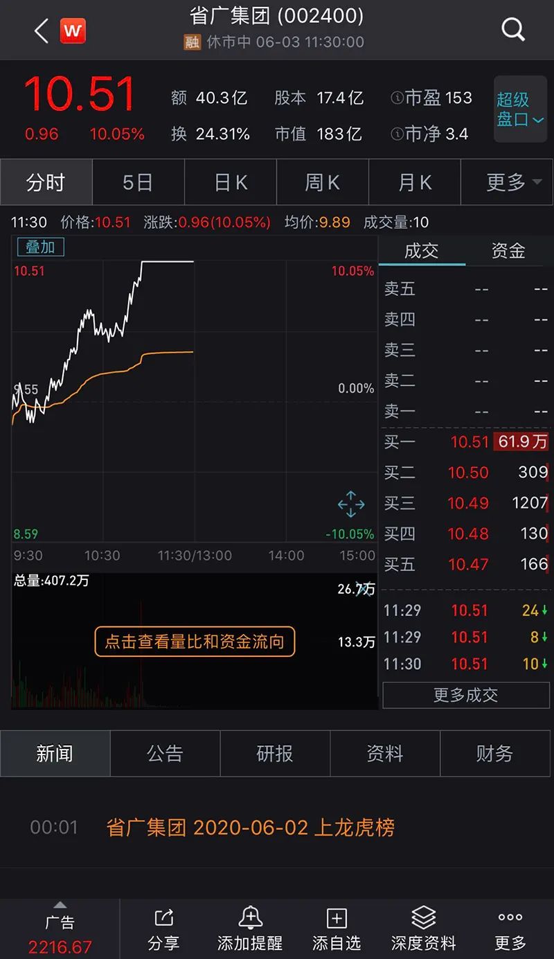 今日早盘剧情反转,省广集团小幅低开后一路走高,10:57分左右拉升封板,封单金额超8亿元,走势不可谓不妖。