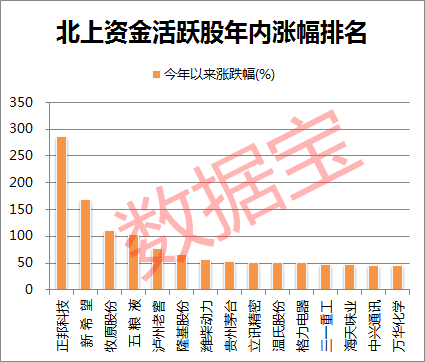 北上资金参与的活跃股买入卖出状况不同,但其整体表现却可圈可点。数据宝统计显示,截至昨日收盘,今年以来,上述45股平均涨幅为41.96%,大幅度跑赢同期沪指。11股年内涨幅超过50%,其中正邦科技、新希望、牧原股份、五粮液今年涨幅均翻倍。