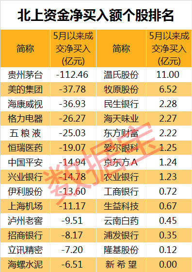 8只活跃股获北上资金净流入逾亿元,温氏股份净流入规模最高,达11亿元。温氏股份自5月15日以来北上资金持续净流入,其最新收盘价也重新回到60日线上方。该股今日实施每10股税前派5元利润分配方案。另一只农业股牧原股份北上资金净流入6.52亿元排在其后,民生银行、海天味业、东方财富北上资金净流入均超2亿元。