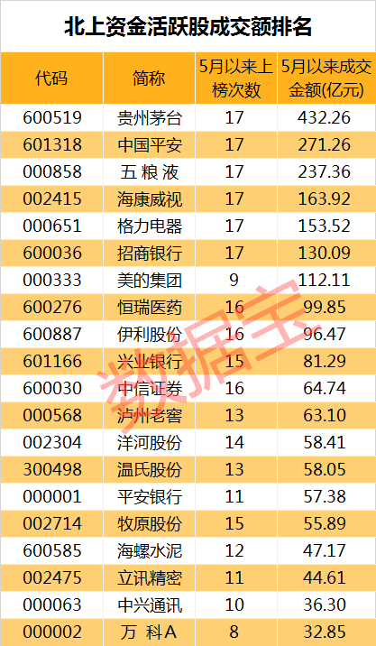 从本月北上资金十大活跃股的成交情况来看,目前共有45股上榜,其中招商银行、中国平安、五粮液、格力电器、海康威视、贵州茅台每日均上榜,5月以来这6股北上资金参与交易金额均达百亿元以上,贵州茅台交易金额最高,达到432.26亿元。中信证券、伊利股份、恒瑞医药、牧原股份、兴业银行等上榜次数均在15次以上。美的集团上榜次数虽不到10次,但其累计成交金额也达到百亿元以上。