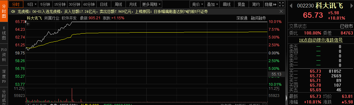 今日国产AI龙头股科大讯飞股价高开后单边走高,仅用了不到一个小时就强势封死涨停板,截至收盘,该股全天成交逾62亿,涨停封单超8万手,总市值超过1500亿元。值得一提的是,午后部分AI强势股出现跳水现象,但该股依然稳稳封死涨停。