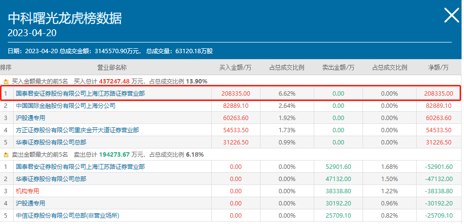提及国泰君安上海江苏路营业部,相信不少投资者应该不陌生,该营业部被认为是市场知名游资章盟主的席位。早在1个月之前AI概念股大火的时候,这家营业部曾一度斥巨资逾20亿元抢筹中科曙光,此举引发市场高度关注,也被市场“戏谑”章盟主“20亿以下不分仓”。