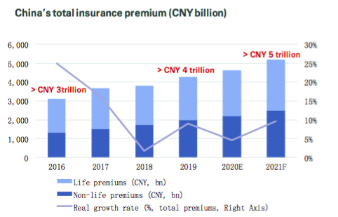 中国引领全球保险市场,预计2021年中国保费超5万亿