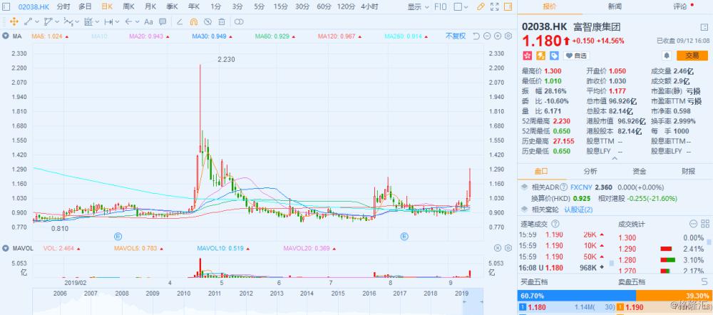 就在郭董宣布退党不久,“郭台铭概念股”下的富智康集团(02038.HK)股价旋即出现暴力拉升,一度涨超25%。但其后其股价出现一定回调,至收盘报1.18港元,涨幅收窄至14.56%。