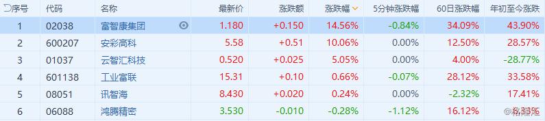 其他“直属概念股”方面,云智汇科技(01037.HK)涨5.05%、讯智海(08051.HK)涨0.24%、鸿腾精密(06088.HK)微跌0.28%。