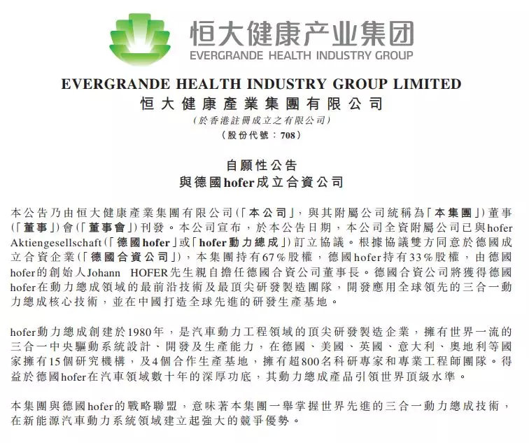 “根据协议双方同意于德国成立合资企业,本集团持有67%股权,德国hofer 持有33%股权,由德国hofer的创始人Johann HOFER先生亲自担任德国合资公司董事长。”恒大健康称,德国合资公司将获得拥有德国hofer在动力总成领域的最前沿技术及最顶尖研发制造团队,开发应用全球最领先的三合一动力总成核心技术,并在中国打造全球最先进的研发生产基地。