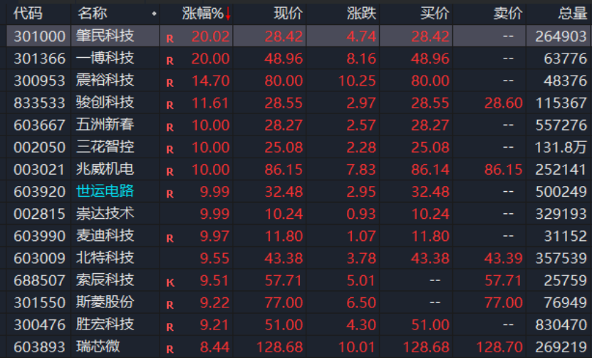 人形机器人板块更是在午后大幅拉升,截至收盘,该板块涨停个股接近10只,包括肇民科技、一博科技、震裕科技等。液冷服务器板块今日也走势强劲,康盛股份、飞龙股份、双良节能等涨停。