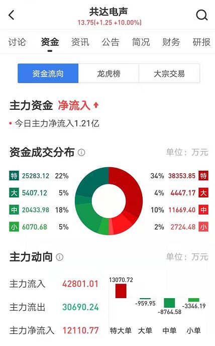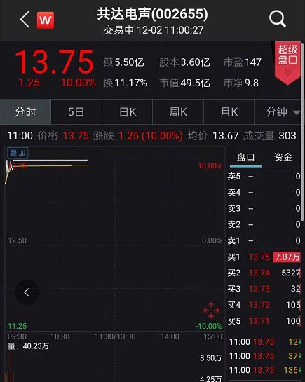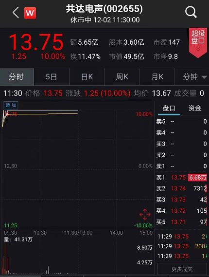 12月2日当天,共达电声开盘不久,股价高开高走,很快就出现了一字涨停态势。截至午盘收盘,近7万手买单封在涨停板上。股价报收13.75元。