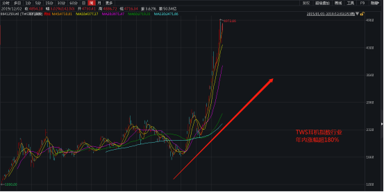 而同时,TWS耳机行业指数也走出了大红的趋势。当天上午,这一高达6200多亿的TWS耳机板块大涨3%,市值大涨超195亿。而截至目前,年内TWS指数更是大涨超180%,妥妥跑赢一众概念指数。