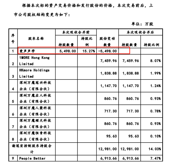 根据12月1日披露的最新公告,本次交易中,共达电声拟通过向万魔声学全体股东非公开发行股份的方式收购万魔声学100%股权,从而对万魔声学实施吸收合并。吸收合并完成后,万魔声学将注销法人资格,共达电声作为存续公司,将承接(或以其全资子公司承接)万魔声学的全部资产、债权、债务、业务、人员及相关权益;同时,爱声声学持有的共达电声5498万股股票将相应注销,万魔声学的全体股东将成为共达电声的股东。
