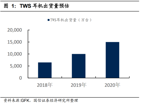 根据Counterpoint Research的预测,2019年全球TWS耳机出货量可达1.2亿台,同比增长160%,2020年TWS耳机出货量大概率可突破2亿台。根据GFK数据,2019年,全球TWS耳机市场规模有望达75.29亿美元,同比增长40.05%,未来市场规模有望持续高速增长。