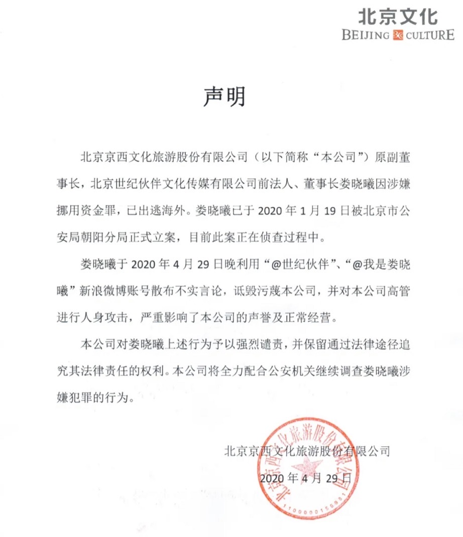 2019年8月,北京文化公告称,娄晓曦申请辞去公司副董事长等职位,但仍担世纪伙伴董事长。彼时,娄晓曦给出的理由是“工作调整原因”,北京文化董事会也“对娄晓曦先生在任职期间的工作表示感谢”。而透视此次实名举报来看,双方已彻底撕破脸。