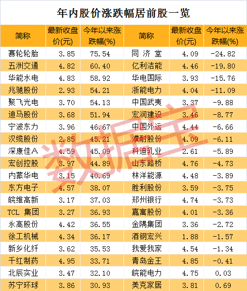 部分低价股年内股价表现不俗。数据宝统计显示,6只个股年内累计涨幅超过50%,分别是赛轮轮胎、五洲交通、华能水电、兆驰股份、聚飞光电、迪马股份。