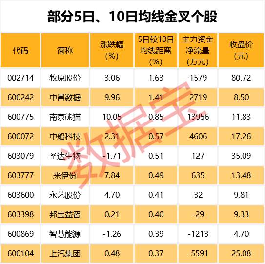 截至8月28日收盘,有34只A股的5日均线主动上穿10日均线,其中牧原股份、中昌数据、南京熊猫等个股的5日均线较10日均线距离最大,分别达1.63%、1.41%、0.85%。