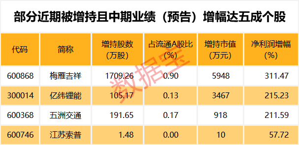 结合中期业绩(业绩预告)来看,梅雁吉祥、亿纬锂能、五洲交通净利润同比大幅增长,增幅分别高达311.47%、215.23%、211.59%。