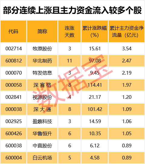 值得注意的是,260只连续上涨个股中,8只个股期间主力资金累计净流入超过亿元。其中,累计资金流入最多的为牧原股份,主力资金累计流入3.55亿元。