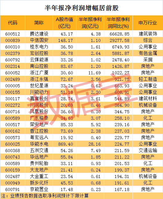 上半年净利润增幅在10倍以上的还有宏创控股、云煤能源、浙江广厦。在已公布业绩预告的个股中,中信国安、南山控股、世纪星源、粤宏远A、海航投资等股净利润有望翻倍增长。