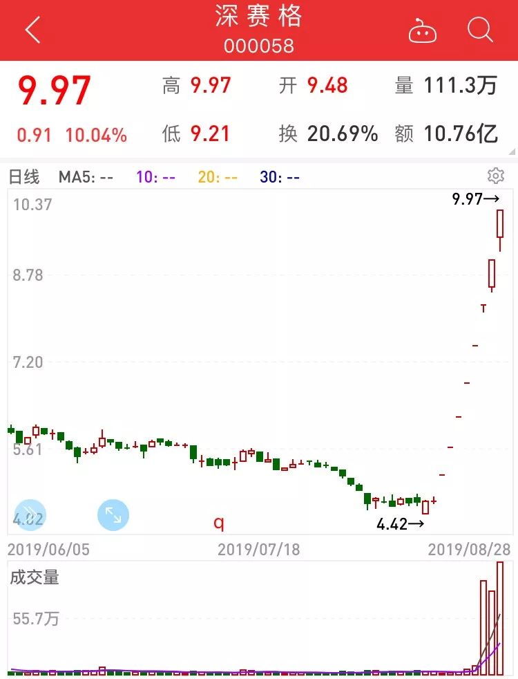 深赛格八连板,一跃成为近日市场最牛股。在本次启动前,深赛格股价一路震荡下跌至5元以下,且成交量也持续地量,直到8月19日,因深圳本地股的集中爆发,深赛格瞬间成为大热门,近8个交易日连续涨停,涨停板数量位居当前A股第一位。