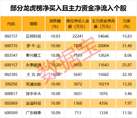 从盘口资金流向来看,主力资金净流入超千万且龙虎榜净买入个股共有9只,其中正邦科技、罗牛山、大北农等个股资金净流入金额最大。净流入力度最大的个股有罗牛山、永泰能源、大北农,净流入力度分别为31.40%、25.87%、22.30%。
