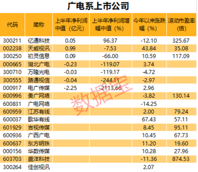 从披露的中报情况来看,虽然广电系个股大多业绩下降,但降幅已开始放缓,少数已转向高增长。比如,天威视讯上半年业绩下降7.53%,相比一季度业绩大跌32.21%,上半年整体降幅回到个位数,显示出公司的业务已经基本回到正轨。(数据宝 王林鹏)
