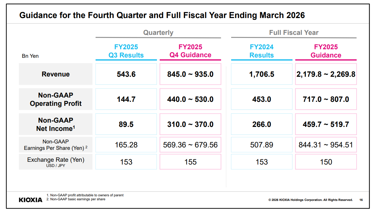 作为背景,在铠侠2月发布的2025财年三季报中,公司预期将于今年3月底结束的2025财年实现4597亿至5197亿日元的净利润,其中光是今年前三个月贡献的部分就有3100亿至3700亿日元。