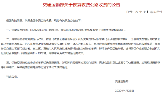 据交通运输部消息,经国务院同意,从2020年5月6日零时起,经依法批准的收费公路恢复收取车辆通行费。此前,为统筹疫情防控和经济社会发展,全国收费公路从2020年2月17日零时起免收车辆通行费。受疫情和免收各类车辆通行费政策实施影响,高速公路行业上市公司一季度业绩颇“受伤”,最惨重的招商公路一季度亏损超过7亿元。二级市场上,高速公路类A股公司股价普遍下跌,与春节前相比板块市值蒸发逾200亿元。招商证券表示,长期来看,高速公路运营企业的基本面主要取决于我国宏观经济的活跃程度,随着疫情消散,车流量和收费都将回归正常水平。如果综合考量投放规模和不良率,高速公路行业属于历史表现良好且稳定的少数行业之一。据交通运输部网站4月28日消息,经国务院同意,从2020年5月6日零时起,经依法批准的收费公路恢复收取车辆通行费。从2月17日算起,全国收费公路免收车辆通行费,本次临时免费天数达到80天,还剩约8天时间。高速公路恢复收费到底怎么收?哪些有优惠?ETC用户需要注意什么?划重点来了。