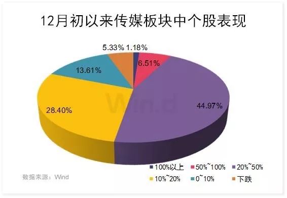 年底传媒板块全面受到资金青睐,Wind数据显示,自去年12月2日阶段低点以来,板块中169只个股,共有160只上涨,占比高达94.67%。其中引力传媒以涨幅177%遥遥领先,紧随其后中广天择、华扬联众等12家上涨超过50%。此外上涨20%~50%之间还有76家,可见近一个多月传媒板块中个股一片火热,成为资金持续买入的对象。
