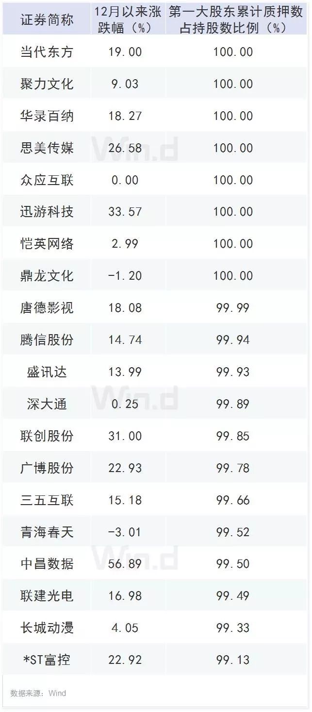 传媒股整体质押数量也较多,Wind数据显示,169家上市公司,目前有135家公司股东出现过质押融资。其中世纪华通和金科文化两家股东质押数量最多,合计质押都超过21亿股,质押比例分别为35.86%和59.65%。紧随其后利欧股份、中公教育、瀚叶股份等5家股东质押都在10亿股以上。这些质押股份中,第一大股东往往都是质押大户。目前共有20家公司第一大股东质押比例在99%以上,几乎全部质押了其手中的持股。如果质押率较高的话,一旦股价出现较大的回落,或有一定的质押风险。