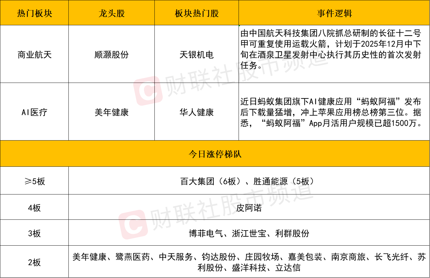 商业航天概念股再度走强,顺灏股份、天箭科技、西部材料、北摩高科、盛洋科技等个股涨停,天银机电、中国卫星、上海沪工、上海瀚讯等个股涨幅居前。消息面上,由中国航天科技集团八院抓总研制的长征十二号甲可重复使用运载火箭,计划于2025年12月中下旬在酒泉卫星发射中心执行历史性的首次发射任务。