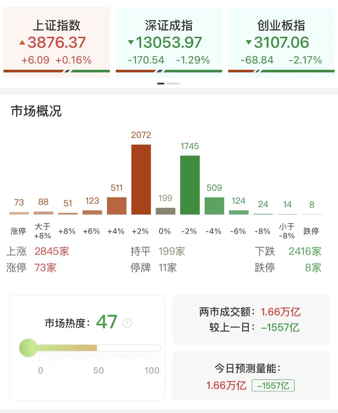 三大指数涨跌不一,沪指低开回升,创业板指低开低走跌超2%。沪深两市成交额1.66万亿,较上一个交易日缩量1557亿。全市场近2900只个股上涨。从板块来看,银行板块震荡拉升,上海银行涨超3%,零售概念走强,中央商场、上海九百涨停。商业航天概念走势活跃,盛洋科技2连板,顺灏股份涨停。医药商业延续强势,鹭燕医药2连板,重药控股7天4板。IP经济概念表现活跃,广博股份、三湘印象涨停。下跌方面,锂电池板块回落,海科新源、华盛锂电大跌。截至收盘,沪指涨0.16%,深成指跌1.29%,创业板指跌2.17%。